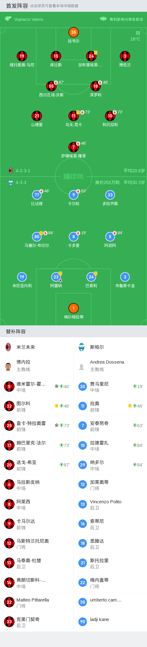 比赛继续进行,斯帕尔不甘示弱,他们在第83分钟形成角球攻势,最终由阿雷纳乱战破门,将比分扳平为1-1。但是扳平比分并没有让米兰未来放弃,他们在第85分钟再次发起猛攻,利用前场界外球制造机会,查卡-特拉奥雷完成一记俯冲头槌,将比分改写为2-1,为球队赢得胜利。
